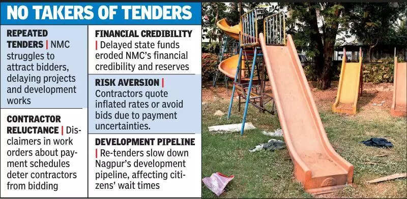 NMC struggles to attract bidders as repeated tenders delay garden projectsNagpur: The Nagpur Municipal Corporation (NMC) floated a fresh e-tender on September 11 for installing outdoor adventure climbing sets in six city gardens, including Mahatma Phule, Suyog Nagar, Shankar Nagar, and Dhantoli. Marked as a “2nd call”, the Rs88.10 lakh tender is the latest example of how the civic body is struggling to attract bidders for even basic development works. This is not an isolated case. Between April 1 and September 11, NMC issued 684 tenders worth Rs1,492.82 crore. Of these, 65 tenders — together valued at Rs309.82 crore — were reissued. Departments worst affected include public works (30), electrical (15), public health engineering (5), garden (3), health/medicine (1), and water works and zone No.6 (two each).The garden tenders reflect a wider contractor reluctance. In recent years, NMC has inserted disclaimers in work orders that payments for state-funded projects will be cleared only after govt grants are received. This clause, introduced during a financial crunch, has made contractors wary of projects ranging from garden equipment to routine civic works.The roots of the problem go back to the Uddhav Thackeray govt, when state funds to NMC were delayed. Forced to dip into its reserves, the corporation eroded its financial credibility. Contractors now treat NMC tenders as risky, often quoting inflated rates to hedge against payment delays or avoiding bids entirely.Adventure parks planned in six gardens have already suffered. While four firms have bid for the flagship project at Lata Mangeshkar Garden — a Rs8.79 crore, two-acre facility with 15 adventure activities — no agency was finalised in two earlier rounds for the remaining five gardens, which together carry a modest outlay of Rs88.10 lakh. Four agencies have expressed interest in developing the adventure park at Lata Mangeshkar Udyan. Once the technical bids are opened, the selected agency will be assigned the work, said garden superintendent Amol Chaurpagar. Meanwhile, the tender process for setting up facilities in four other gardens has been reissued for the second time.With re-tenders turning into a norm, Nagpur’s development pipeline is slowing to a crawl. Unless NMC restores trust with assured payment schedules, both major infrastructure and smaller amenities risk getting stuck in paperwork, leaving citizens waiting indefinitely.
