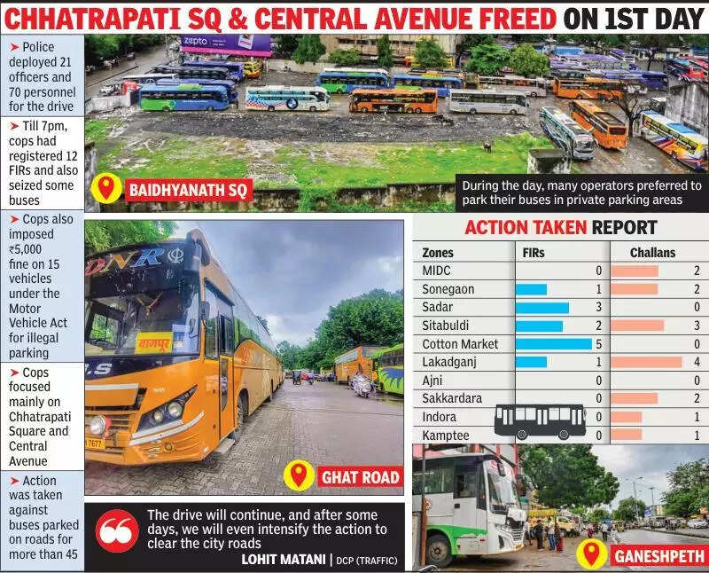 Nagpur: On first day of rollout of the private bus parking ban, traffic police on Wednesday cracked down on vehicles parked illegally on roads, causing traffic jams. However, buses dropping off or picking passengers were spared.Cops registered 12 FIRs against bus operators for violating the recent order issued by DCP (Traffic) Lohit Matani and for causing danger by obstruction.Till evening, the cops dealt with the bus operators with velvet gloves. Instead of taking strict action, they asked bus operators to leave, and some even complied, fearing police action. Such was the impact of the city police action that by 9pm, Chhatrapati Square, which usually witnesses long lines of private buses, and traffic chaos because of it, was completely devoid of buses.The traffic department had on August 12 issued a notification banning the pick-up and drop service of private bus operators inside the Inner Ring Road boundary. Police also gave seven days to the operators to find locations, with the deadline of August 20.On Wedenesday, police launched the drive against the operators but focused on illegal parking and not the pick-up and drop service, which they had mentioned in the notification.Speaking to TOI, DCP Matani said police on Wednesday took action against private vehicles illegally parked on streets. “The drive will continue, and after some days, we will even intensify the action to clear the city roads,” said the DCP, adding that many vehicles were parked on roads for more than 45 minutes. Police deployed 21 officers and 70 personnel for the drive.Till 7pm, cops had registered 12 FIRs and also seized vehicles, which were later sent to the respective police station.The FIRs were registered under section 223 and 285 of Bhartiya Nyaya Sanhita. Cops also imposed a 5,000 fine on 15 vehicles under the Motor Vehicle Act for illegal parking.TOI on Wednesday also visited many spots in the city where private buses pick-up and drop passengers. Interestingly, during afternoon hours, at locations like Chhatrapati Square, Bole Petrol Pump, Ravi Nagar, Rahate Colony, and Central Avenue, the private operators were picking up and dropping passengers like usual. However, by evening, the police went into action and started cracking down heavily. However, police also started removing the buses rather than only issuing challans.“On Wednesday, we focused mainly on Chhatrapati Square and Central Avenue, where the menace of private buses is higher,” said DCP Matani.Meanwhile, the process of identifying locations for private buses for pay and park is also underway inside city limits. Police also made announcements against parking of private buses at Chhatrapati Square.
