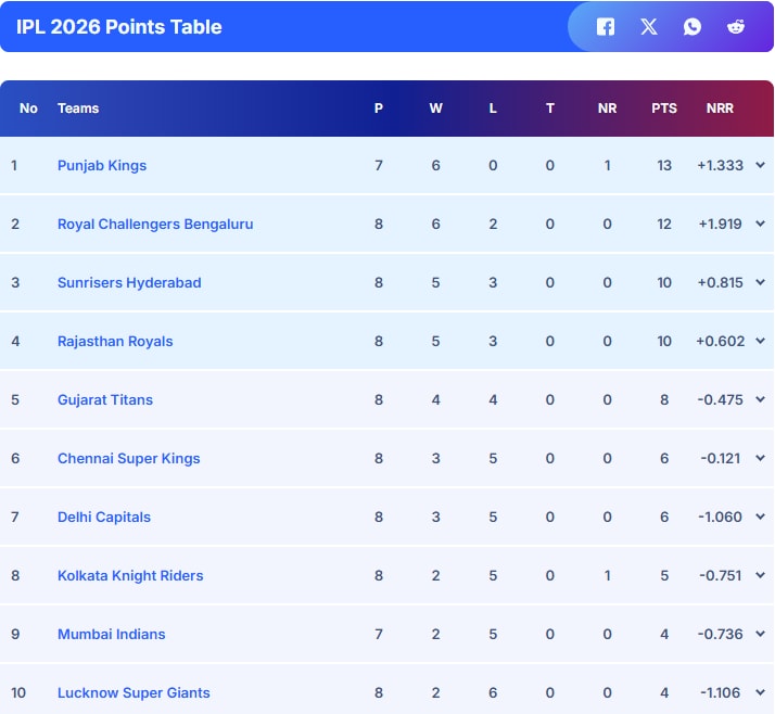 IPL 2026 Points Table: Royal Challengers Bengaluru Take Huge Step Towards Playoffs, Delhi Capitals At 7th Spot