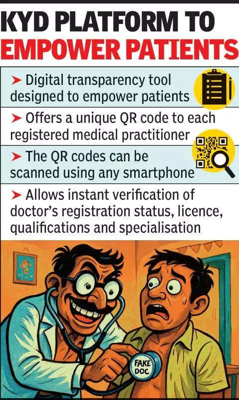 Nagpur: Despite Maharashtra Medical Council (MMC) launching a forward-thinking initiative to help patients verify doctors and curb quackery, response from the medical fraternity is far from encouraging. Out of over 1.4 lakh registered medical practitioners across the state, only about 10,000 have signed up for the ‘Know Your Doctor’ (KYD) initiative and received their personalised QR codes, meant to be displayed at their clinics for public verification.This means that a vast majority of clinics still do not provide patients an option to quickly and easily verify whether their doctor is a genuine, licensed professional — something crucial especially in rural and vulnerable areas plagued by fake medical practitioners.Speaking to TOI, MMC administrator Dr Vinky Rughwani from Nagpur said, “This initiative is extremely helpful to patients. They can just scan the QR code displayed in the clinic using their smartphone, and it will directly take them to the MMC portal, where all verified details of the doctor — including specialisation — are available.”Maharashtra was the first state in the country to launch such initiative to counter quackery, and after us, many other states as well as councils like homeopathy and ayurveda followed suit. “I appeal to all registered medical practitioners in Maharashtra to come forward and participate in this drive,” said Dr Rughwani.Recently, Maharashtra health minister Prakash Abitkar informed the state legislative assembly that the govt is considering making this QR code registration mandatory for all doctors in the state in order to combat the growing menace of quackery.Fraudulent doctors and unlicensed clinics remain a persistent threat to public health in Maharashtra, particularly in districts with limited healthcare access. Patients often fall prey to unqualified individuals posing as doctors. The QR code initiative gives people a powerful, easy-to-use tool to protect themselves — but only if doctors participate.Until more doctors adopt the initiative, patients are urged to look for the KYD QR code in clinics, scan it before proceeding with consultations, and spread awareness about the importance of verifying medical credentials.