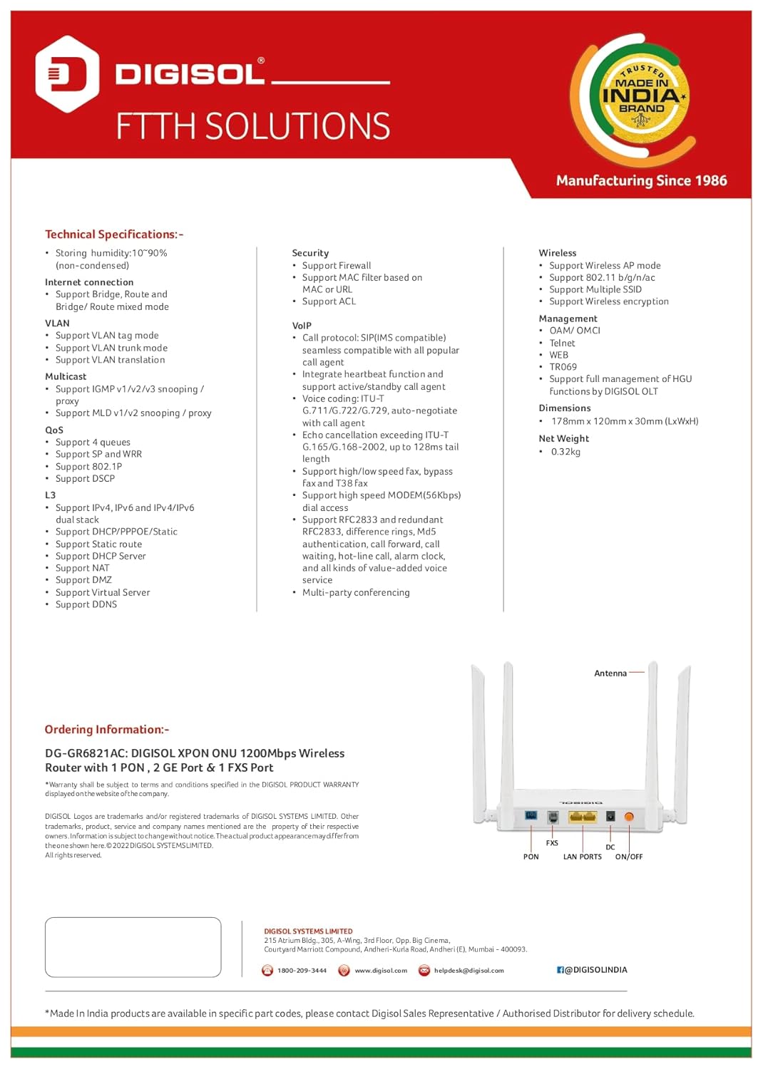 Cable Connector Digisol DG-GR6821AC XPON ONU 1200 Mbps Wi Fi Router with 1 PON, 2 GE Port & 1 FXS Port (BSNL Port)