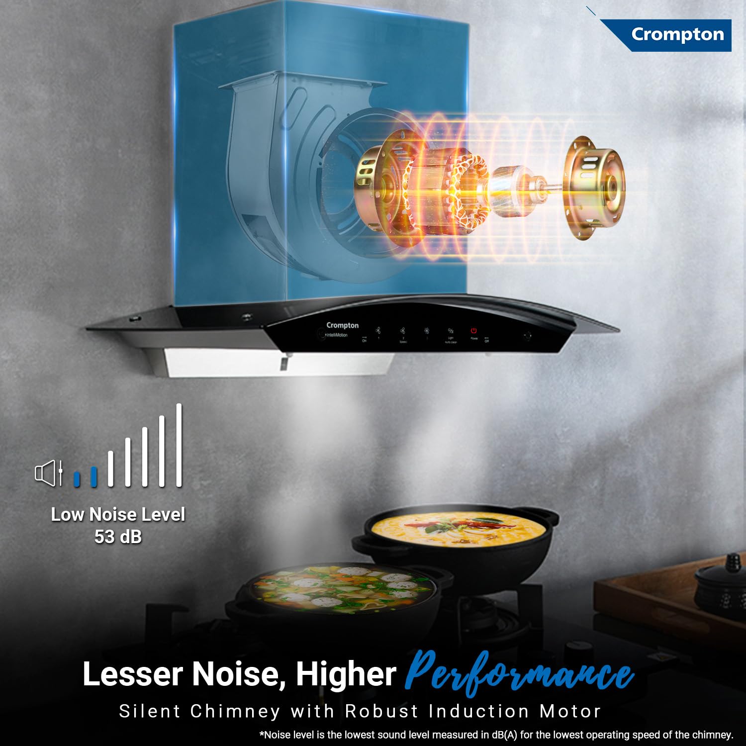 Low Noise – Crompton Intellimotion chimney operates at a minimum noise level of 53 dB, ensuring a quiet and peaceful cooking environment.