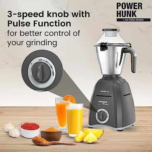 Havells Power Hunk (4 Jar) 800 watt Mixer Grinder with 3 Wider mouth Stainless Steel Jar, Hands Free operation, SS-304 Grade Blade & 7 year motor warranty (Grey)