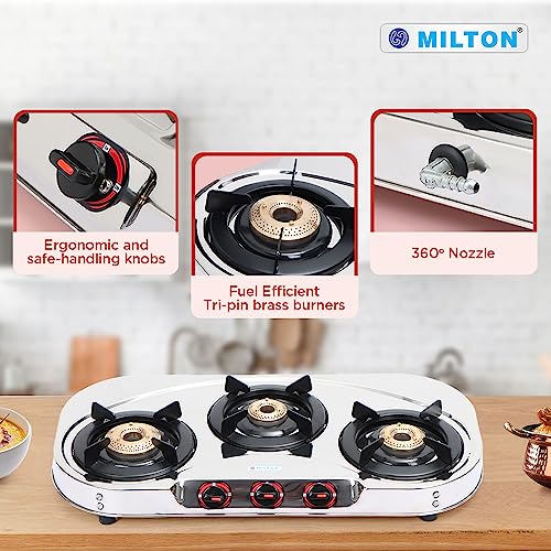 ✅ High-Efficiency Brass Burners: Equipped with high-efficiency tri-pin brass burners that provide quick and efficient heating, reducing cooking time.It Features three brass burners that offer versatile cooking options to cater to your diverse culinary needs. It is Equipped with heavy-duty pan supports that offer reliable and stable support for your cookware, ensuring safe and stable cooking.
