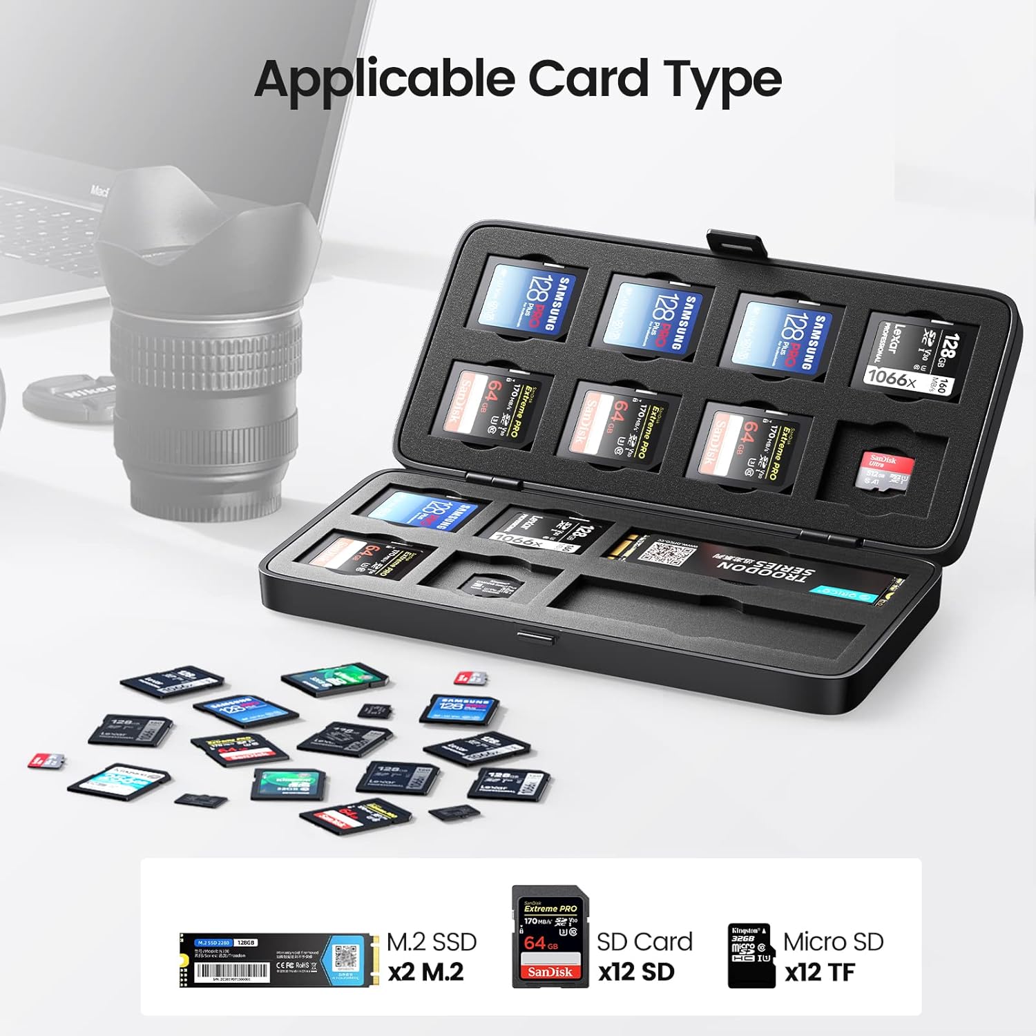 【Big Capacity】Sd card holder stores 12 pieces SD card + 12 pieces micro SD card (TF card)+ 2 pieces M.2 SSD in the both side slots, each slot is strictly tailored to fit the card perfectly make the cards organized. Please note that SD card/ TF card /M.2 SSD ARE NOT INCLUDED in the memory card case.