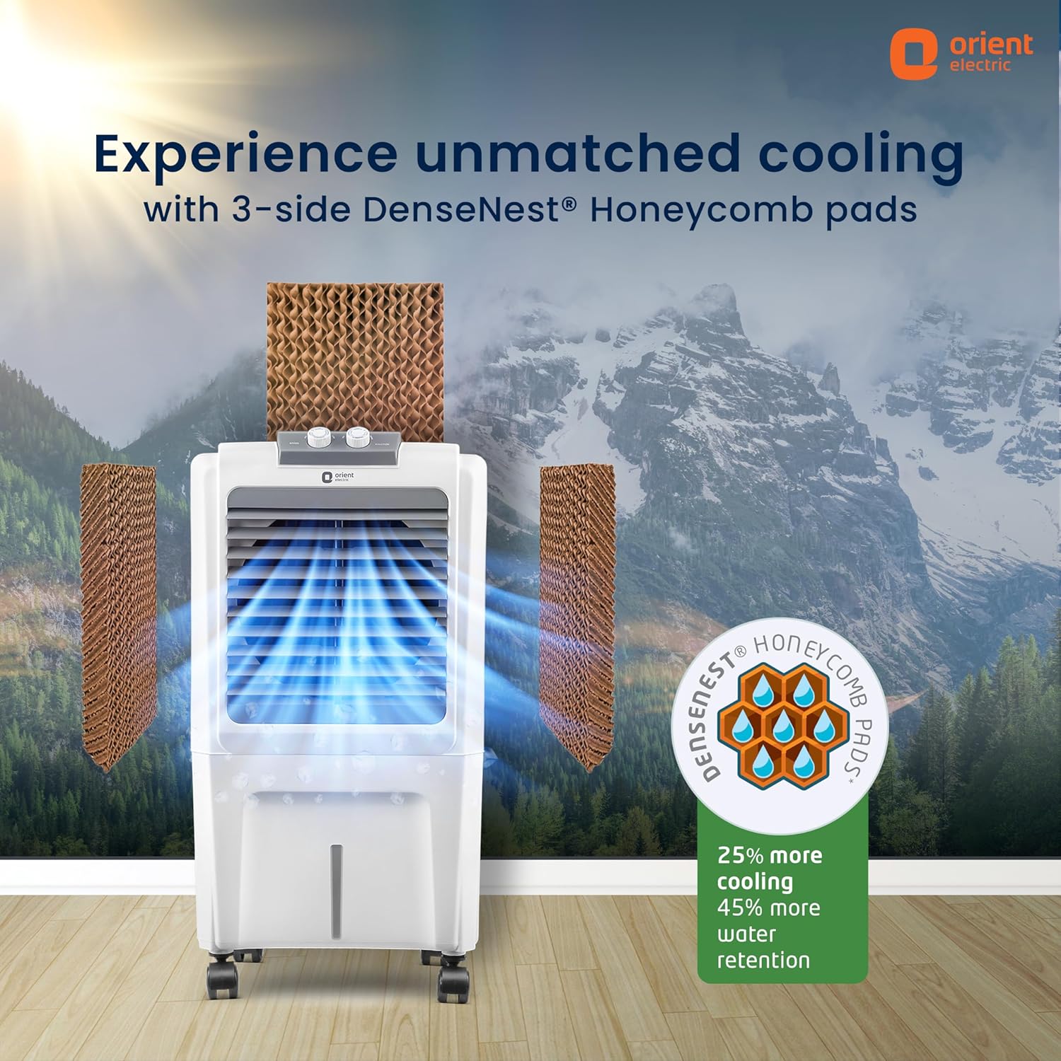 3-side Densenest Honeycomb cooling pads: With unique Densenest Honeycomb pads that retain 45% more water, our air cooler gives 25% extra cooling, keeping you comfortable even during peak Summers.