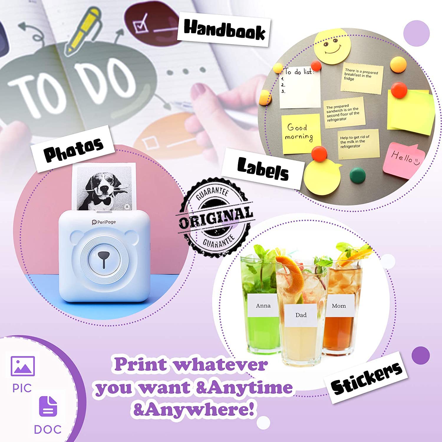 The thermal printer can print photos, labels, stickers, messages, lists, records, QR codes.It can be used to print notes and bottle notes at home.The label printer can be used to print notes while working.And it can be used for memos, photos, etc. when traveling.