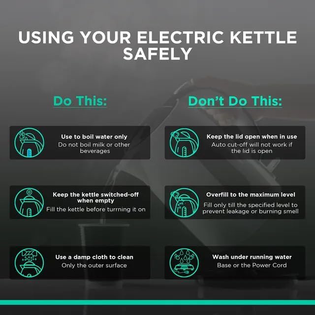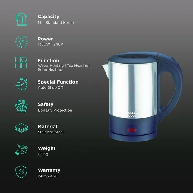 Capacity 1litre, 360 d rotation baseAuto shut off when water boilsWide mouth design for cleaningSmall size suitable for travel needsWattage: 1350wPower: 100 watts
