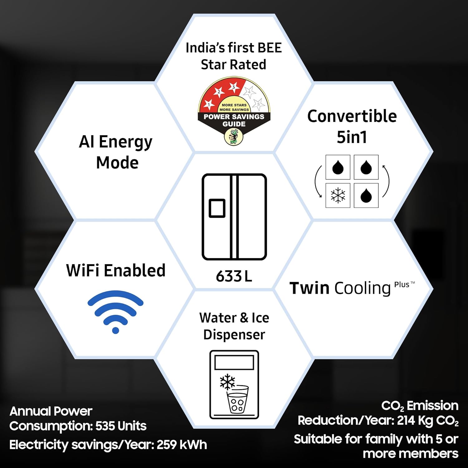 Special Features : Convertible 5-in-1 | Twin Cooling Plus | Wi-Fi Embedded | Smat Things App | Smart Things AI Energy Mode | Ice & Water Dispenser(Non Plumbing) | Dual Ice Maker | Power Freeze | Power Cool | Precise Cooling | Fingerprint Resistant | Built-in Look