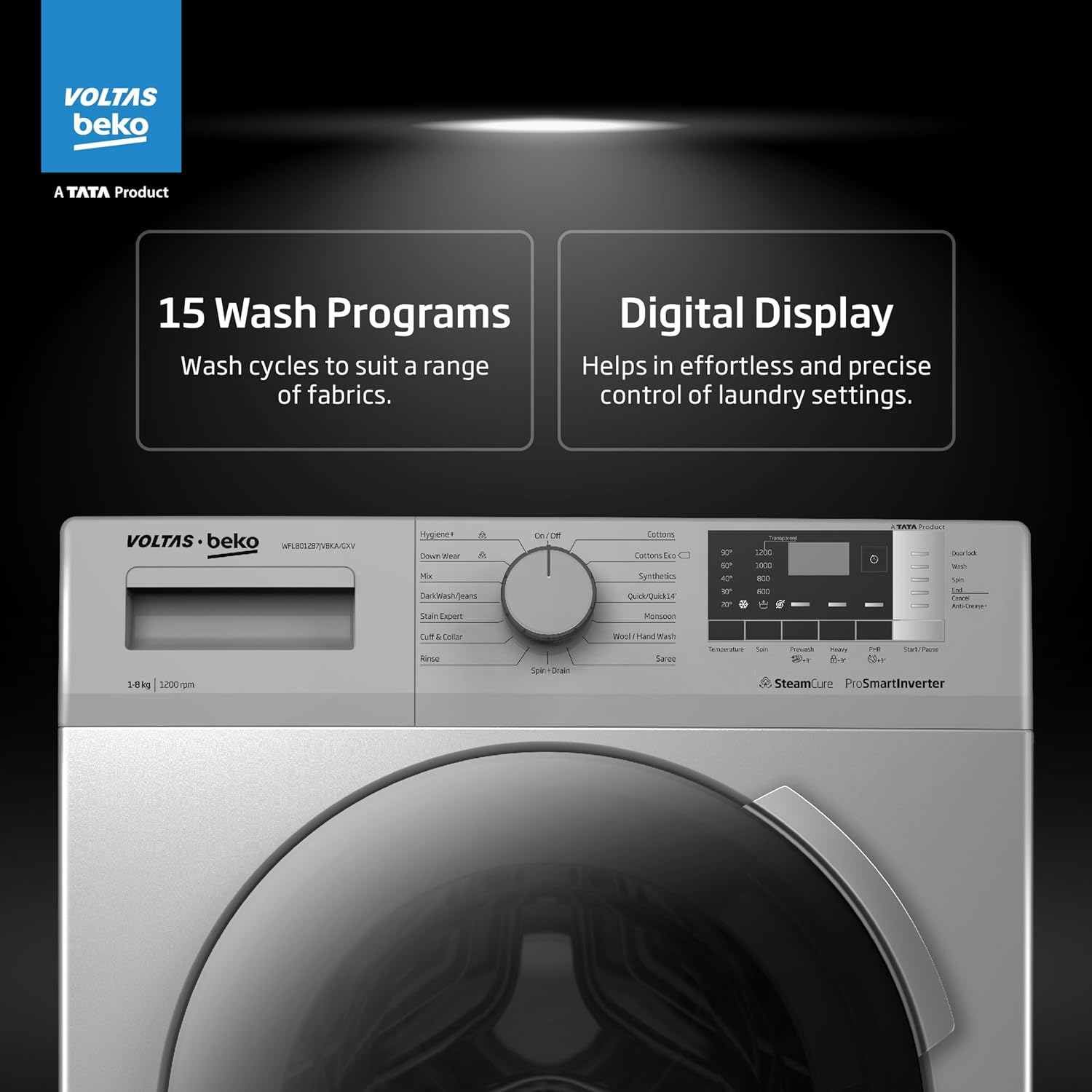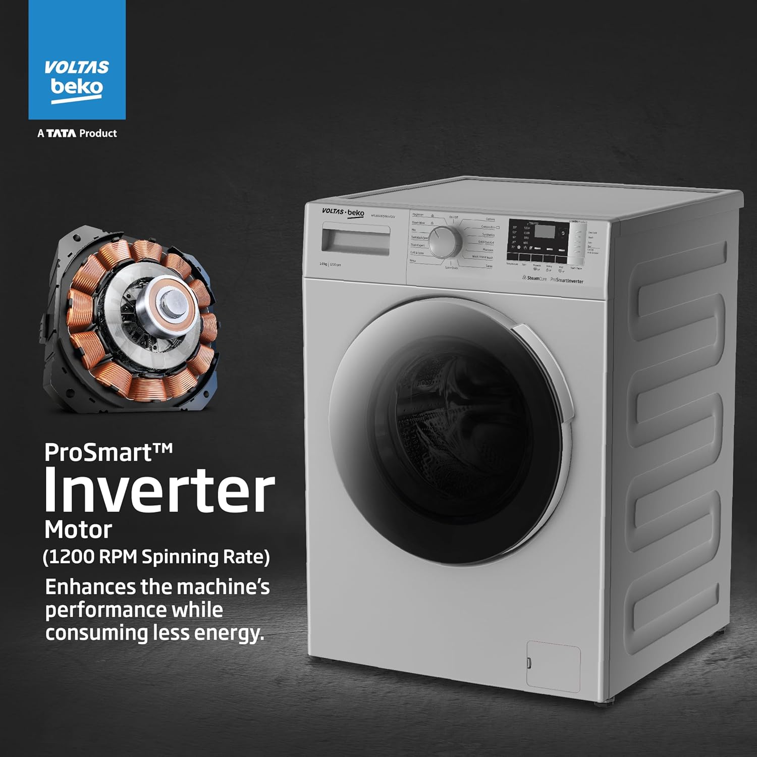 Voltas Beko, A Tata Product 8 Kg 5 Star Inverter Quick wash Fully-Automatic Front Loading Washing Machine (2023 Model, WFL8012B7JVBKA/GXV, Grey, In buit Heater/Hygiene steam)