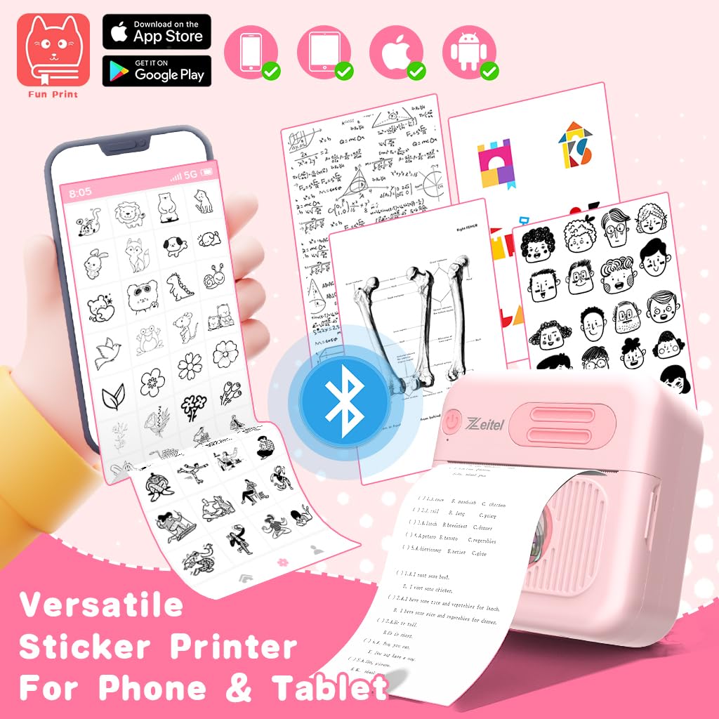 ZEITEL® Mini Bluetooth Thermal Printer, Portable Label Inkfree Mini Printer for Android & iOS System, Black on White Thermal Printer with 15 Rolls of Print Paper, 8 Colors of Pencils, Stickers, Pink