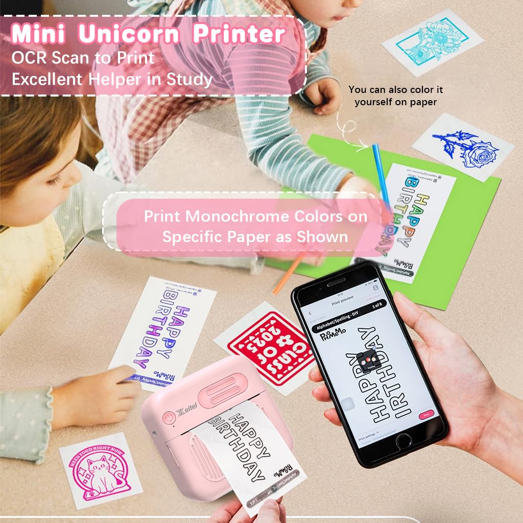 UPGRADE UNICORN MINI BLUETOOTH THERMAL PRINTER: Upgraded Bluetooth mini printer features unique unicorn design style. Mini thermal printer built-in 15 rolls of printing paper(57*25mm), 8 colors of pencils, 1 unicorn stickers, 1 USB cable, 1 user manual.
