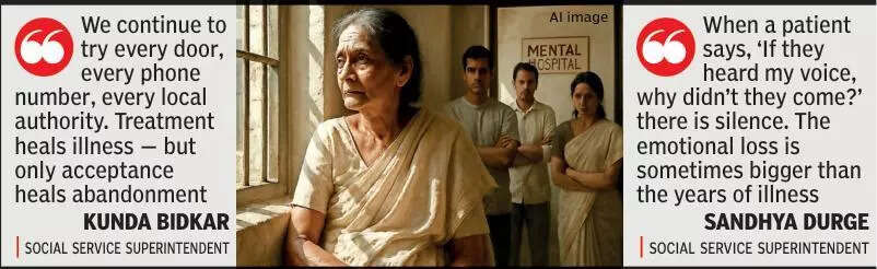 Nagpur: At the Regional Mental Hospital (RMH), Nagpur, recovery doesn’t always mean going home. For 45 fully recovered patients, the journey to normalcy has halted — not because of lingering illness, but because of rejection from their own families. Despite successful treatment and psychiatric recovery, many remain institutionalized due to family refusal, inheritance conflicts, remarriages, or simply the erosion of emotional bonds over decades. “When a patient says, ‘If they heard my voice, why didn’t they come?’ there is silence,” said Sandhya Durge, social service superintendent for the male wards, adding, “The emotional loss is sometimes bigger than the years of illness.“Currently, about 15 male patients at RMH are in intermittent contact with their families, yet reunions remain elusive. Some relatives speak on the phone but refuse to visit or take responsibility. One patient from Karnataka, missing for nearly four decades, was recently traced through interstate coordination — but even after hearing his voice, his family declined to bring him home.Many men in the wards keep a small bundle of clothes ready, waiting in quiet hope each morning for the words, “You’re going home today.”Nine women patients continue to live in the hospital despite recovery. While the numbers have reduced thanks to persistent outreach, social workers say deep family fractures make reintegration difficult. One 77-year-old woman from Chandrapur, admitted in 1967, has outlived every known relative. Another, a 63-year-old from Nanded missing since the mid-1990s, was hospitalized in 2005. Her husband remarried, and her adult sons refused to take her back. “It is painful to see a mother denied by her own children,” said Kunda Bidkar (Katekhaye), social service superintendent for the female wards.Meanwhile, about 32-36 recovered male patients with no traceable family will soon be shifted to rehabilitation homes for community-based care — a step towards dignified living outside the hospital’s walls.The reintegration drive is being led by Dr Satish Humane (medical superintendent), Dr Mohbey (deputy medical superintendent), and Dr Pankaj Bagde (HOD, Maher Unit), along with RMH’s social service teams.“We continue to try every door, every phone number, every local authority,” Bidkar said adding, “Treatment heals illness — but only acceptance heals abandonment.”