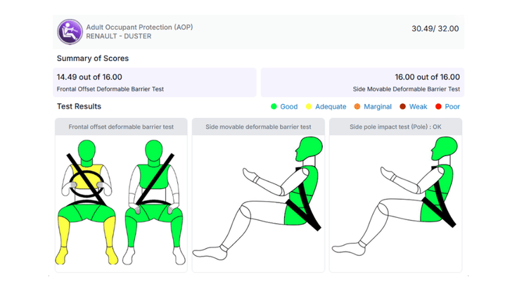 While the Duster and Seltos received a 5-star safety rating in adult occupant protection (AOP) tests, the latter scored 1.21 points more in the frontal offset deformable barrier test. This is because the Seltos received a ‘good’ protection rating to the chest and right tibiae of the driver, while the Duster received ‘adequate’ protection for those parts. However, both SUVs received a ‘good’ protection rating for the head, pelvis and thighs of the driver, and for all critical parts of the front passenger. Moreover, the Seltos has achieved the highest score in the frontal offset deformable barrier test out of any ICE-powered car tested by the BNCAP. On the other hand, both SUVs received full marks in the side-movable deformable barrier test, and an ‘OK’ rating for the side pole impact test.