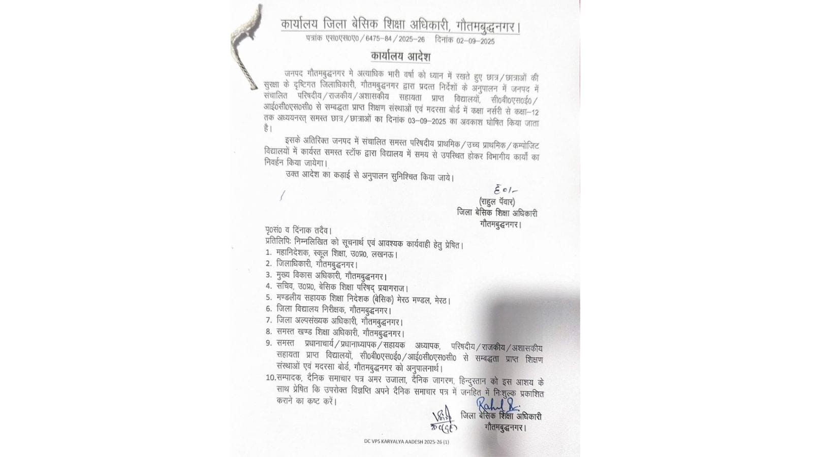 Following the order of the Gautam Buddha Nagar District Magistrate, schools will remain closed for all students from Pre-Nursery to Grade 12 on September 3, 2025 (Wednesday) due to heavy rainfall. The official order for Ghaziabad school holidays, issued under the direction of District Magistrate Ravindra Mandad and enforced by Basic Shiksha Adhikari (BSA) O.P. Yadav, states that all schools and colleges will remain closed tomorrow to ensure the safety of students.