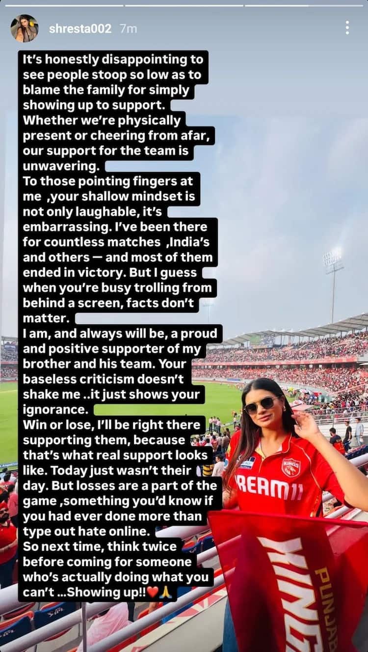 After the match, Shreyas Iyer’s sister, Shresta Iyer, revealed that she was subjected to online trolling by a section of fans blaming her for PBKS’s defeat. Addressing the matter on Instagram, she hit back at the trolls, criticizing their “shallow mindset” and defending her right to support her brother and his team.