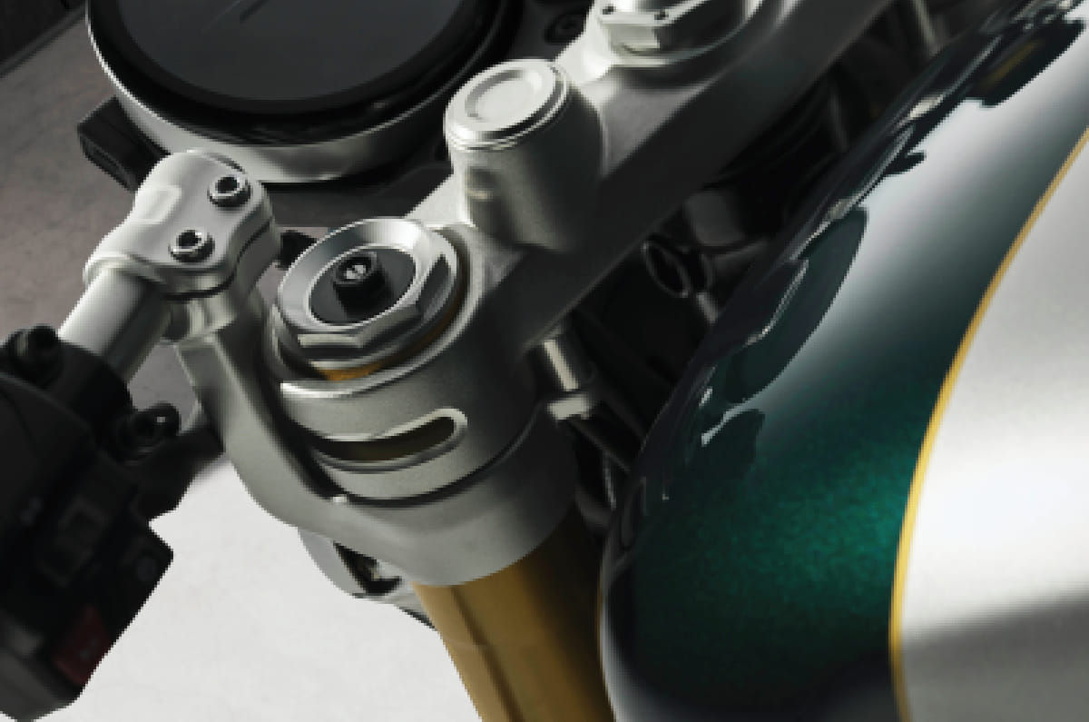Power comes from a 1,200cc parallel-twin engine producing 105hp at 7,750rpm and 112Nm of torque at 4,250rpm. The cafe racer styling is defined by clip-on handlebars creating a low, tucked riding position, a streamlined single-seat profile, and machined bar-end mirrors that reinforce the clean silhouette. Suspension duties are handled by a fully adjustable Marzocchi USD fork paired with Öhlins twin rear shocks, while braking comes from twin 320mm floating discs gripped by Brembo Stylema calipers.