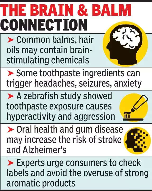 Nagpur: In a shocking link between everyday hygiene products and neurological health, doctors and neuroscientists raised fresh concerns about ingredients commonly found in toothpaste, balms, and essential oil-based products that may silently impact the brain over time. Observations made during World Brain Week prompted researchers to highlight the potential neurotoxic effects of substances such as camphor, menthol, and eucalyptus — common components found in daily-use products. Experts suggest checking labels and avoiding the overuse of strong aromatic products.“Many of these ingredients can cross the blood–brain barrier via the buccal mucosa, bypassing liver metabolism,” said Dr Thomas Mathew, vice dean at St John’s Medical College, Bengaluru. “Repeated exposure, especially every 24 to 48 hours, can lead to a phenomenon called chemical kindling, where brain neurons become hyperexcitable, possibly triggering seizures, migraines, or other neuropsychiatric disorders,” Mathew said.Patients with unexplained headaches, seizures, anxiety, and even depression showed improvement simply by switching their toothpaste or stopping the use of certain balms, revealed Padma Shri Dr Chandrashekhar Meshram, trustee of the World Federation of Neurology. “These are not allergic reactions but neurostimulation effects. We’ve seen cluster headaches and migraines vanish within days of stopping using particular brands,” he added.A landmark case series published recently in The International Journal of Head and Face Pain also documented cluster headaches linked to toothpaste use, which resolved upon discontinuation of a particular brand. Experimental studies in zebrafish showed that even brief exposure to toothpaste triggered aggression, anxiety, and hyperactivity, suggesting potential impact on the brain.“The concern is not that these products affect everyone, but that they could be contributing to unexplained neurological symptoms in susceptible individuals,” said Dr Meshram. “We need collaborative research and funding to explore safe alternatives like water or saline-based oral hygiene products.”The spotlight also fell on oral health as a window to brain health. New studies linked gum disease and poor dental hygiene with higher risks of Alzheimer’s, Parkinson’s, and even stroke. “Regular flossing was associated with up to 22% reduction in ischemic stroke risk,” noted Dr S Sen, a researcher from the US.As evidence grows, neurologists are urging both the public and policymakers to consider the hidden neuro-health impacts of seemingly benign daily products, and to explore safer, inert alternatives. THE BRAIN & BALM CONNECTIONCommon balms and hair oils may contain brain-stimulating chemicals Some toothpaste ingredients can trigger headaches, seizures, and anxietyA zebrafish study showed toothpaste exposure causes hyperactivity and aggressionOral health and gum disease may increase the risk of stroke and Alzheimer’sExperts urge consumers to check labels and avoid the overuse of strong aromatic products