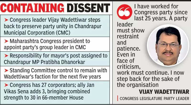 The meeting was attended by Maharashtra Congress in-charge Ramesh Chennithala, state Congress president Harshvardhan Sapkal, MP Dhanorkar, and Wadettiwar, among others, who reviewed the evolving political equations in the city following the civic poll results.Speaking to media, Wadettiwar said he had prioritised the party’s interests over personal considerations. “I have worked for the Congress for 25 years. A party leader must show restraint and patience. Even in the face of criticism, the work must continue. This time too, I have stepped back for the sake of the organisation,” he said.Wadettiwar claimed that the Congress has 27 corporators and that its ally, the Jan Vikas Sena, has three, taking the combined strength to 30 in the 66-member House. He said MP Dhanorkar had taken responsibility for mobilising the support of four more corporators required to secure a majority. The Congress corporator named by Dhanorkar, he added, would be the party’s mayoral nominee, while the Standing Committee for the next five years would be from his side.Outlining broader political arithmetic, Wadettiwar said Shiv Sena (UBT), with 6 corporators, has formed a group of 8 by aligning with 2 members of the Vanchit Bahujan Aghadi. He noted that 2 Congress rebel independents would be crucial, as they had indicated their support would depend on the mayoral candidate.Political observers said these 10 corporators could decisively influence the formation of power. While Congress needs only 4 more members to stake a claim, a shift by this bloc towards the BJP-led alliance—currently at 24—could propel the saffron camp to a commanding majority.